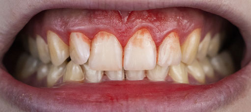 Gingivitis is a common gum disease and the mildest form of periodontal disease. It is the result of bacterial buildup on the teeth. This buildup irritates surrounding gum tissue and can cause the gums to become inflamed, discolored, and painful to the touch. The gums are likely to become red, swollen, and tender. They may bleed easily during daily cleanings and flossing.